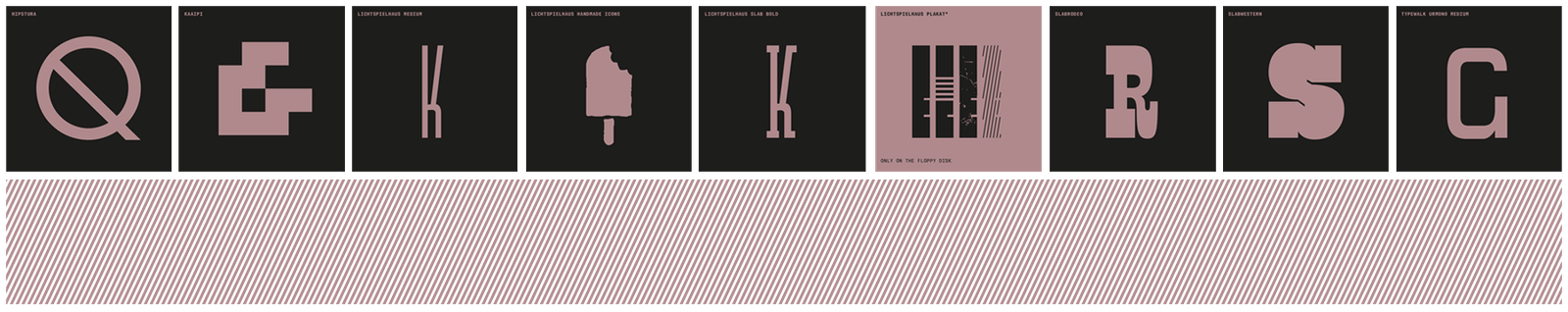 Hipstura, Kaaipi, Lichtspielhaus Medium, Lichtspielhaus Slab Bold, Lichtspielhaus Handmade Icons, SlabRodeo, SlabWestern, Typewalk UrMono and on the floppy disk only: Lichtspielhaus Plakat.